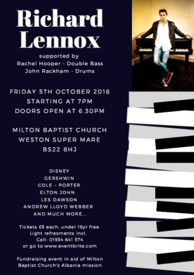 Richard Lennox (piano) supported by Rachel Hooper (double bass) & John Rackham (drums) are giving a concert at this church on Friday 5th October commencing at 7pm....