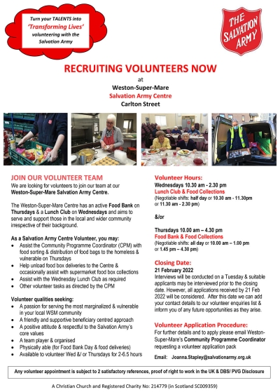 RECRUITING VOLUNTEERS NOW at Weston-Super-Mare Salvation Army Centre Carlton Street